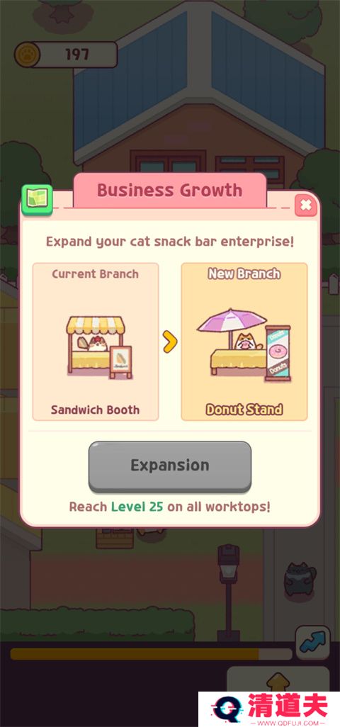 8、当工作台达到25级之后便可拓展您的猫咪小吃店事业,比如开分店,或者开甜甜圈店。