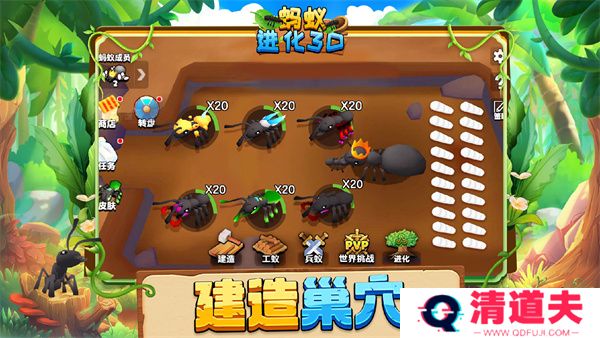 蚂蚁进化3d下载是一款以蚂蚁生存冒险为主题的模拟手游,采用逼真的3D建模,将蚂蚁的微观世界生动呈现。蚂蚁进化3d操作简单,玩法丰富多样,融入了建造、养成、探索和收集等元素,让玩家体验小蚂蚁的精彩生活。在游戏中,玩家可以控制多种类型的蚂蚁完成工作,按照不同功能进行分工,建造属于自己的蚂蚁帝国。在野外收集资源、种植蘑菇、抵御敌人入侵的过程中,不仅能体验蚂蚁社会的独特生态,还能感受到作为一名“小蚂蚁”的成就感与挑战性!