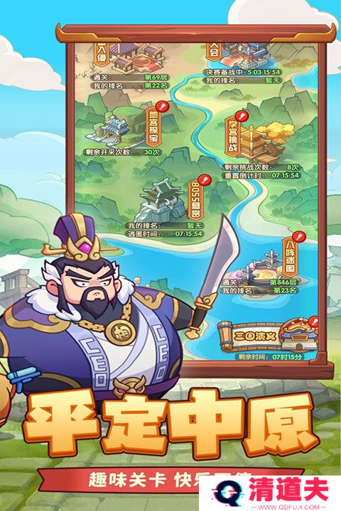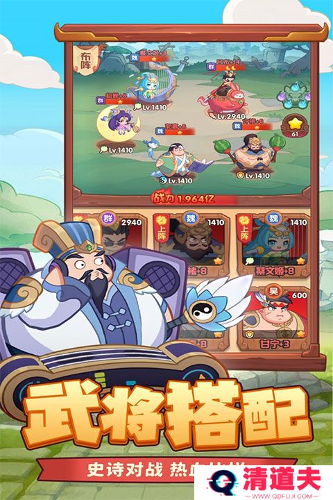 1、游戏采用经典魏、蜀、吴、群四大阵营组成武将类型,每位武将都有独特的属性。