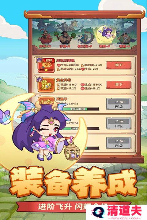 2、前期主线难度低,在精铁不足的情况下,装备可以优先点攻击,提高推图速度,站不住再升其他装备。