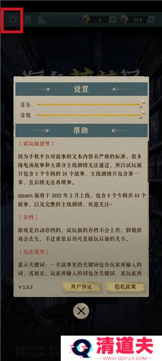 2、首先选择左上角的齿轮设置,这里设置游戏的音效和音乐,同时还有关于游戏的玩法说明,详细阅读可以帮助玩家更快上手。