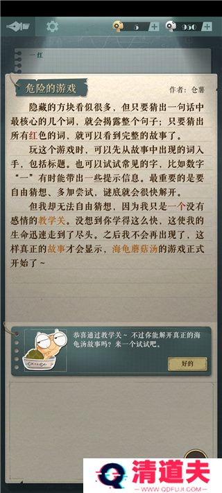 海龟蘑菇汤完整版是一款极具创意的悬疑推理手游,玩家可以自由探索故事线索,体验独特的玩法。新手需完成教程后选择喜欢的故事合集并挑选一个故事开始。海龟蘑菇汤完整版核心是通过输入关键词串联故事情节,逐步揭开完整故事。每当玩家输入正确关键词,相关内容会在文本中显示;若一条句子包含多个关键词,它也会自动显现。当所有红色关键词被解锁后,完整故事便会呈现。