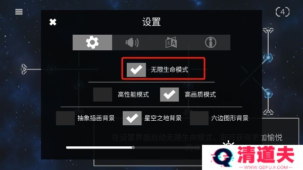 3、接着点击进入设置界面吧无限生命模式打开,可获得更加愉悦的游戏体验。