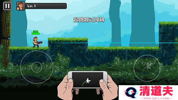 4、左手按住的同时点击右边屏幕起跳,跨越障碍。