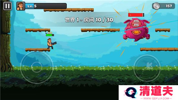 5、两个木板平台之间可以通过左边轮盘的上下键互相跳跃,靠近敌人会自动射击。
