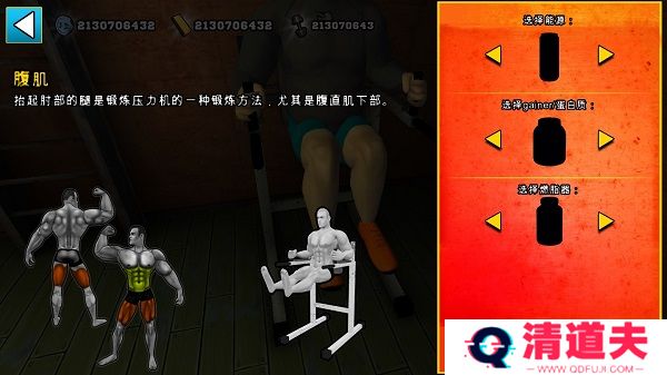 3、使用此按钮开始可用的锻炼,改图显示了锻炼的类型。不同的锻炼项目,有着详细的数据显示,比如要锻炼腹肌,既有配图,也有道具的使用选择,如图: