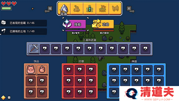 点击菜单栏中的“装备”按钮,可打开装备界面,此处将展示已经解锁的工具、武器、饰品、印章及神器