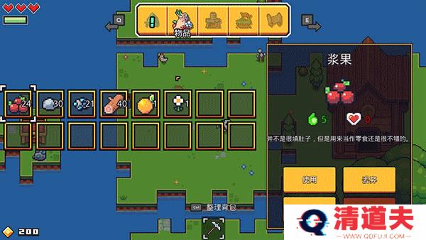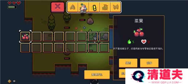 点击相应物品可查看详情,如:图示中的浆果下方的图标标明使用该物品后可恢复5点饥饿值和0点健康值