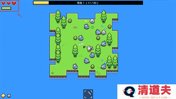游戏界面的左上角的绿色长条表示角色当前的饥饿值,红色爱心表示角色当前的健康值