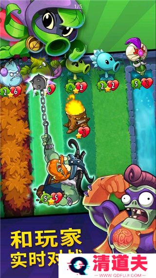 2. 策略对战:玩家需要根据战场情况和对手的卡牌组合,制定合适的战术和策略,合理安排植物卡牌的出场顺序和技能释放时机。