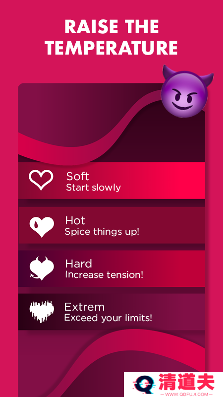 3. 多模式选择:游戏包含温和模式、热辣模式、猛烈模式和超爽模式等多种模式,情侣可以根据互动氛围选择最适合的模式。
