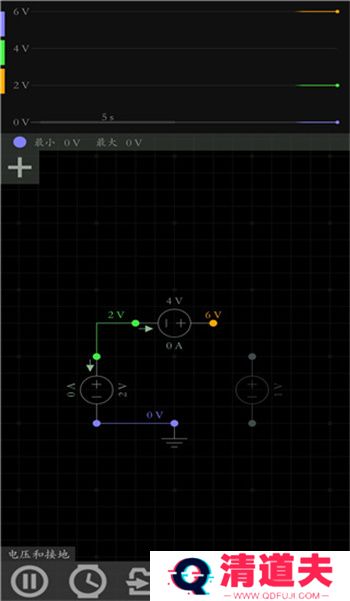 4. 控制面板:用于设置电源电压、电流限制等参数,以及启动/停止电路模拟。