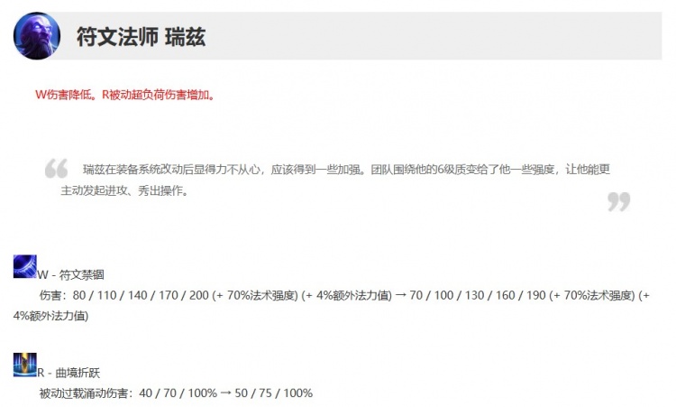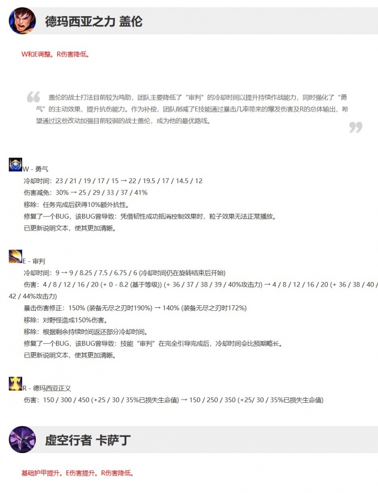 在这个版本中,团队对盖伦进行了玩法更新,旨在使他的战士流构筑更具功能和性能,从而使他远离高爆发的暴击构筑。团队还进行了一系列常规的平衡性更新,从而解决上个版本中未能解决的几个问题,并在整体上把垫底的那些英雄往上抬了抬。