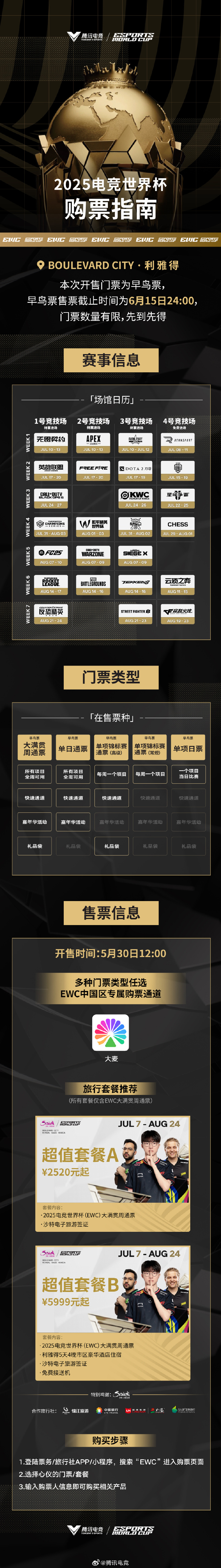 2025电竞世界杯(EWC2025)将于7月7日-8月24日在沙特利雅得举行。在腾讯电竞的支持下,2025电竞世界杯中国玩家购票通道将于5月30日12:00正式开启。为了打造更好的购票体验,腾讯电竞为国内粉丝特别打造专属购票权益,早鸟票销售时间将持续至6月15日24:00。