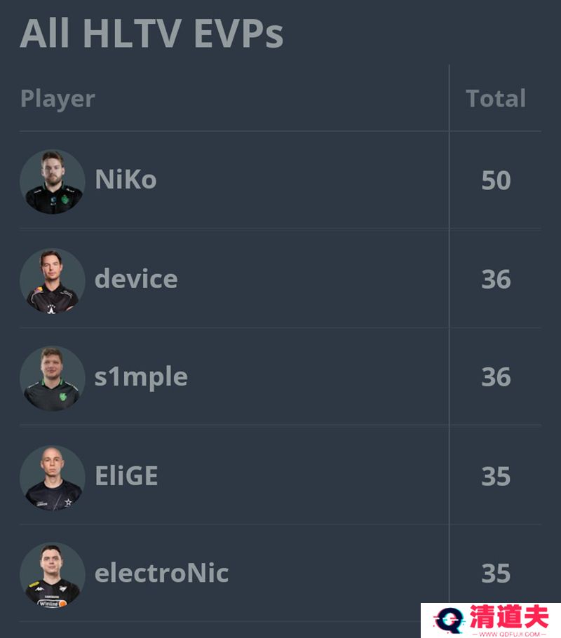 而NiKo也是目前拥有最多HLTV EVP荣誉的选手,device和s1mple并列第二名,为36个。EliGE和electroNic并列第三名,各35个EVP。